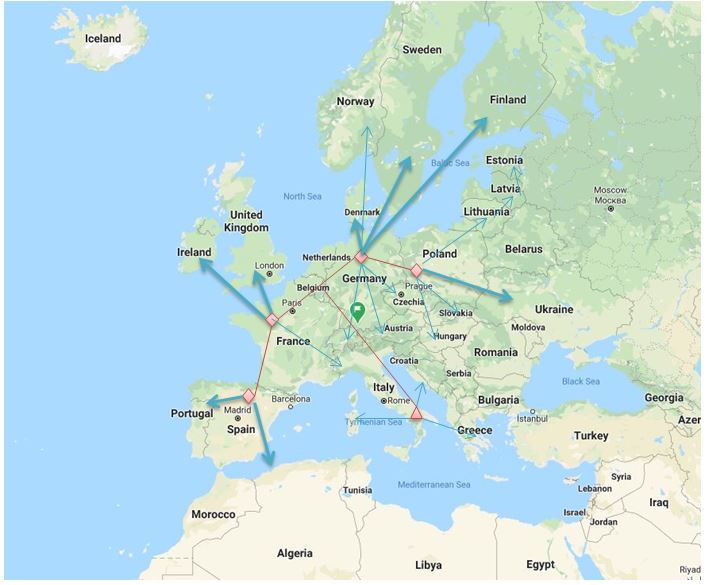 The red lines shows the main railway system, and the blue arrows where the staff could travel from there. Italy got a triangle, because it could host an airport with the same function. It isn’t limited to Italy, though. If other countries are interested, they can host an airport as well.
