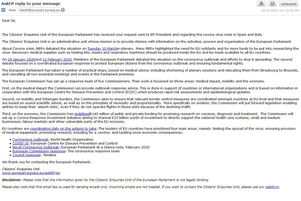 The Citizens’ Enquiries Unit of the European Parliament has received your request sent to EP President and regarding the corona virus crisis in Spain and Italy.