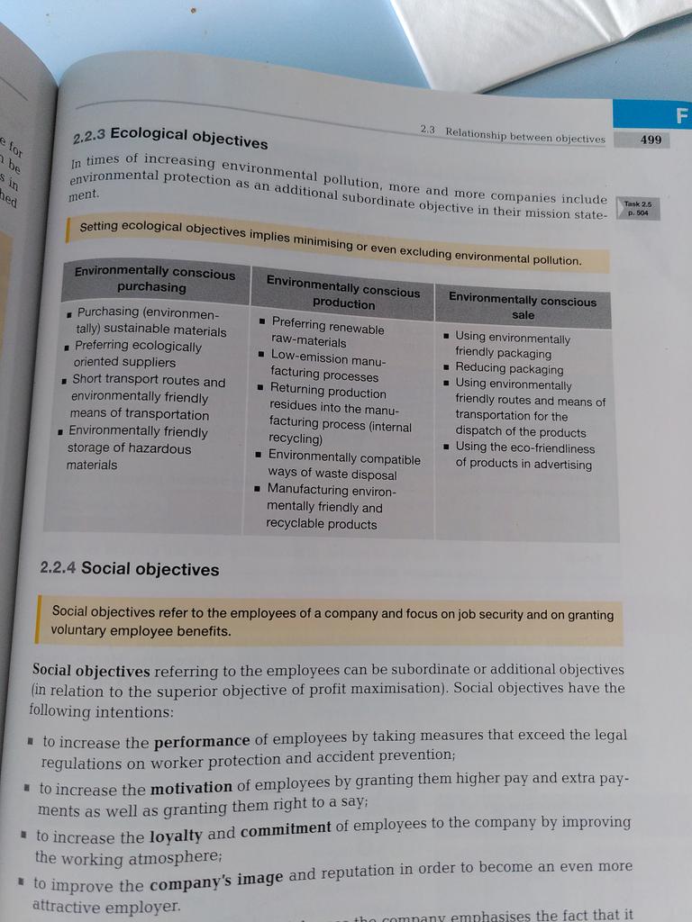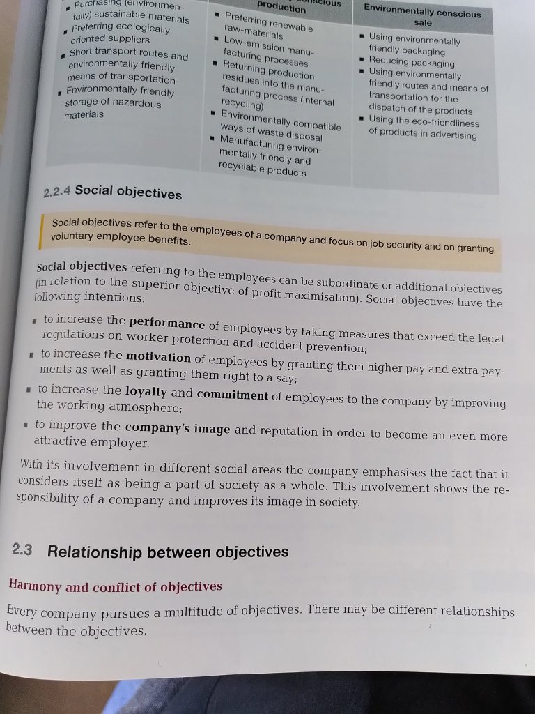 A page in my school book „Betriebswirtschaftliches Handeln international – International Business Managament“, the 3rd edition from the publisher „Europa Lehrmittel“, explains the ecological objectives and social objectives: