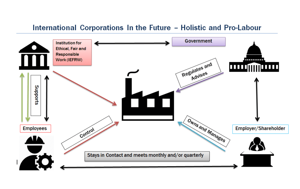 Along with the control council, there’s an institution outside which supports the workers internationally, and as the names gives away, it ensures that the workers are treated ethically (e.g. no hazardous environment or lack of protection) and that the companies do not undermine the function of the control council. The IEFRW also stays in contact with the government and acts as an advisor, and for the representatives as a source of information. The red arrow (control) is meant to indicate that they are constantly observing the company but do not interfere directly.