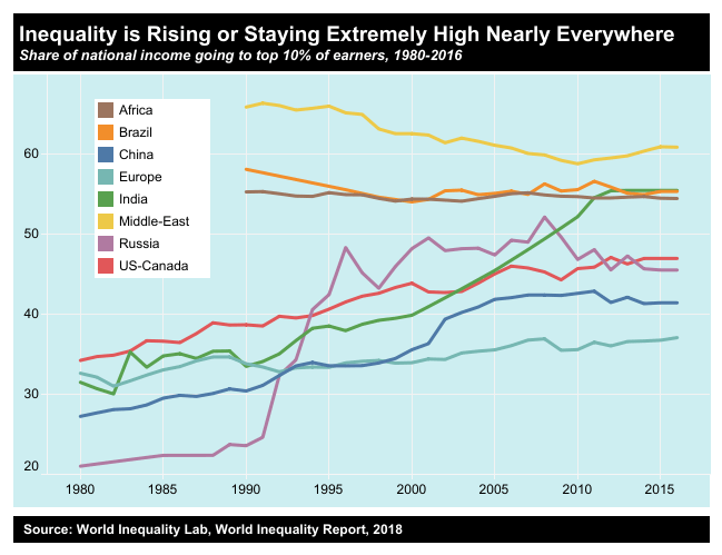 „Seit den 1980ern haben die Daten des World Inequality Report gezeigt, dass der Anteil des Volkseinkommen von den reichsten 1% drastisch angestiegen ist in Nordamerika (hier definiert als die Vereinigten Staaten von Amerika und Kanada), China, Indien und Russland und mehr gemäßigt in Europa. Forscher des World Inequality Lab haben vermerkt, dass diese Periode mit dem Zurückrollen von Nachkriegszeit Strategien um wirtschaftliche Ungleichheiten zu schmälern übereinstimmt. Länder und Regionen die hingegen keine egalitäre Nachkriegszeit Strategien erfahren haben, wie z. B. der nahe Osten, das subsaharische Afrika, und Brazilien, hatten eine relativ stabile, aber sehr extreme Stufen von Ungleichheit.“