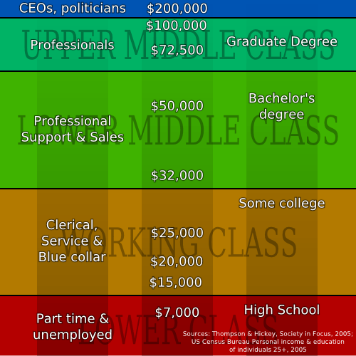 „The middle class (40%) is divided into upper-middle class (14%, earning $76,000 or more per year) and the lower-middle class (26%, earning $46,000 to $75,000 per year).“