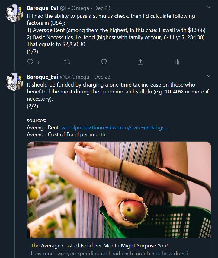 The Covid-19 relief checks, as I mentioned in my Tweet, should be funded by taxing the income of the rich who benefited from the crisis – and still benefit from it -. It is only fair that in return for the workforce and risk that the people take each day, they also deserve to live more comfortably without having to fear evictions and/or hunger. The sum mentioned in the article ($637,000,000,000) could be taxed with 10% ($63,700,000,000) or 40% ($254,800,000,000) for instance (which either then funds it completely or helps funding it). Note: The percentages were chosen arbitrary and serve as an example.