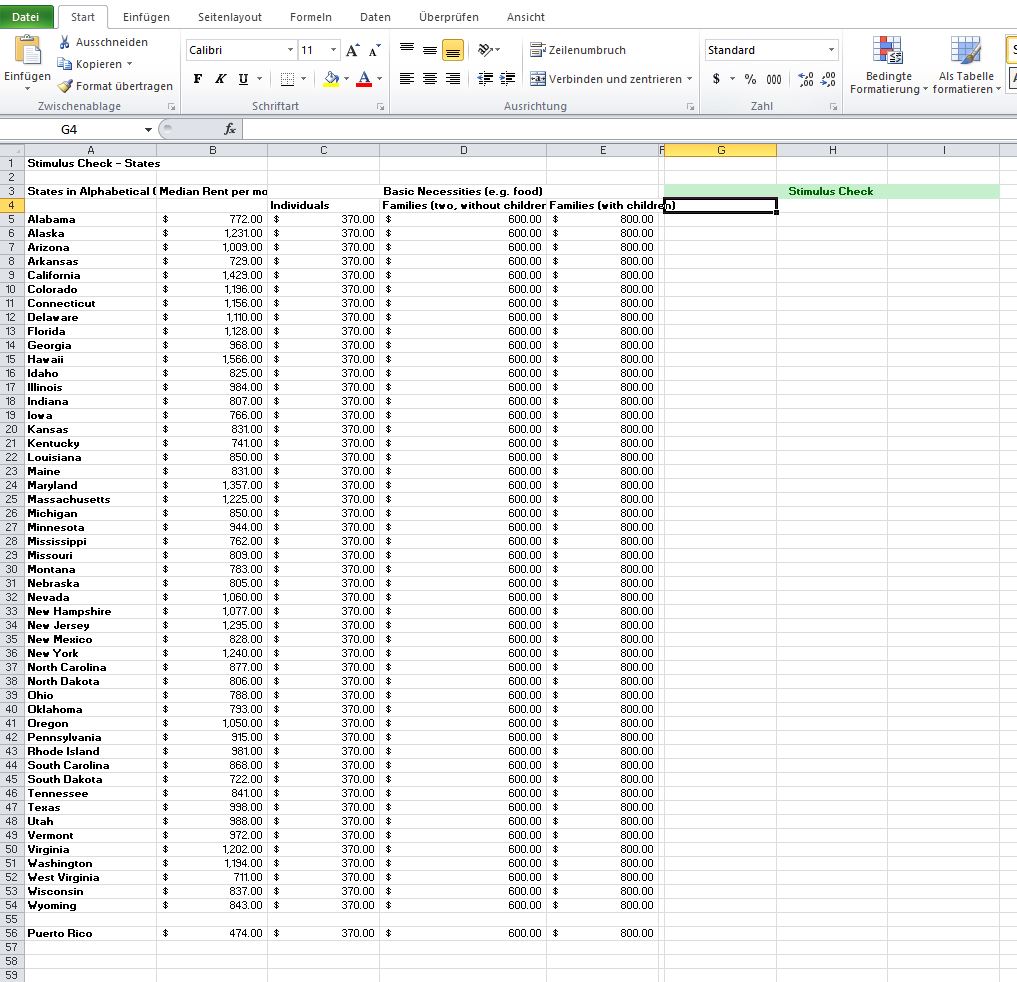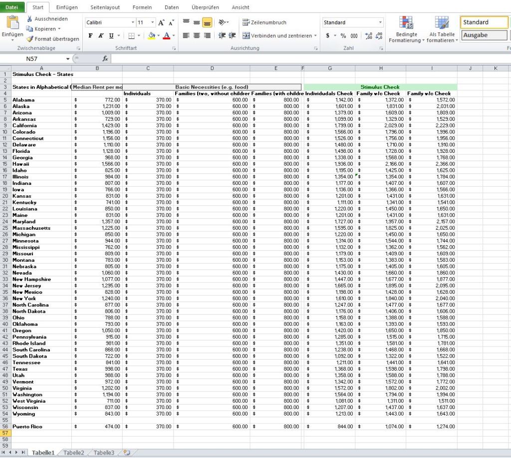 When I looked up the median rent in each state, I saw that $600 aren’t enough. West Virginia, the „cheapest“ state regarding that, is $111 above the sum the US-citizens received. That’s why my first factor included in the state-by-state approach (here I want to thank my Swedish friend for advising me for taking the more specific approach) for the stimulus check was the median rent. No one should be evicted during this massive crisis, which is why the check I designed includes the median rent cost.