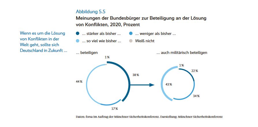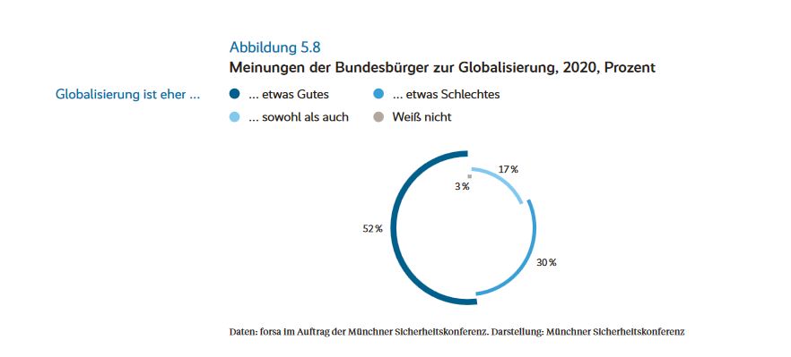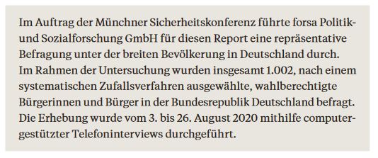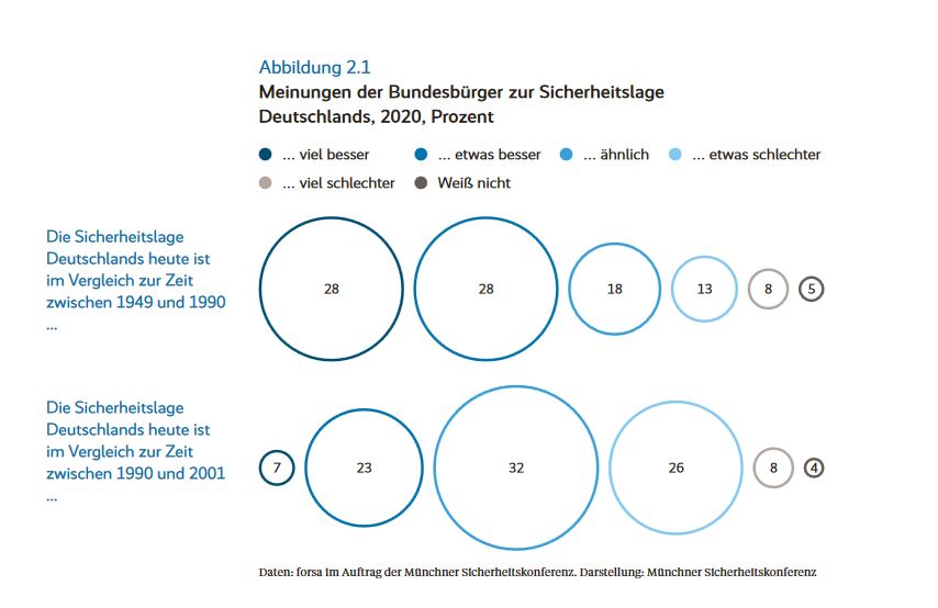 Die Zeitenwende spiegelt sich auch in der Befragung der Bürger wieder. So ergab eine Studie der forsa im Auftrag der Münchner Sicherheitskonferenz, die die Einschätzung der aktuellen Sicherheitslage im Vergleich zur Periode zwischen 1990 und 2001 ermittelte, dass 34% der Befragten die heutige Sicherheitslage als schlechter ansehen (etwas schlechter: 26%, viel schlechter: 8%) und nur 30% als besser (viel besser: 7%, etwas besser: 23%).