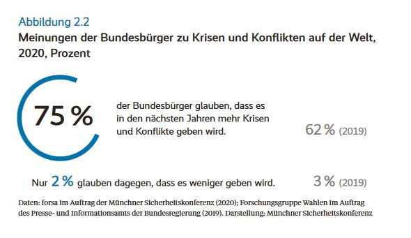 Auch sehen die Befragten keine Verbesserung in der Zukunft; so glauben 75%, dass es in den kommenden Jahren mehr Krisen und Konflikte geben wird. Hingegen glauben nur 2% daran, dass es weniger geben wird.