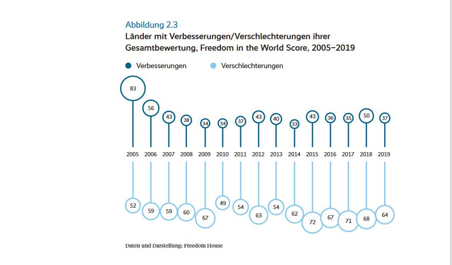 -> Es gibt jedoch ein Zeichen der Hoffnung: „In 44% aller Staaten gab es 2019 substanzielle Massenproteste für demokratische Werte; vor zehn Jahren war das nur in 27% der Länder der Fall.“