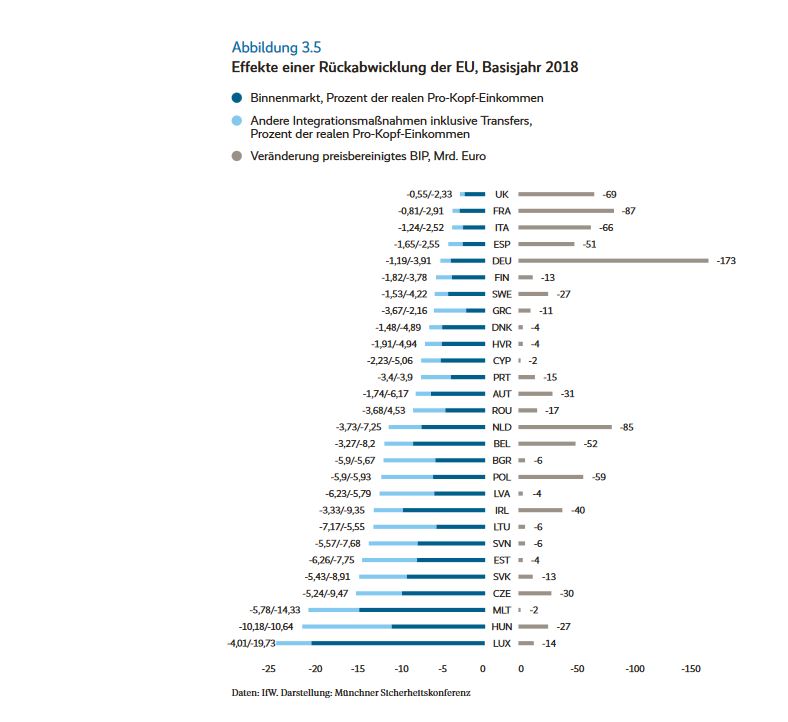 Noch gefährlich für Deutschland wäre ein Szenario einer weltwirtschaftlichen „Entkopplung“ mit der Desintegration der Europäischen Union und ihres Binnenmarktes: