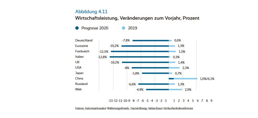 Andere Trends werden auch durch die Pandemie und ihre Auswirkungen verstärkt. Einige Regierungen hätten diese Krisen genutzt, um demokratische Rechte weiter einzuschränken. Auch Krisen in den europäischen Nachbarschaft drohen sich zu verschärfen. So würden auch die Vor- und Nachteile einer offenen Weltwirtschaft nun noch ein schärfer diskutiert werden. Einige Beobachter meinen sogar, dass sich die Gefahr eines Großmachtskonflikts mit der Corona-Pandemie erhöhe. (Seite 43)