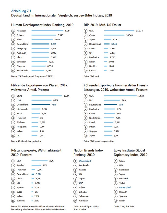 Das Weißbuch der Bundesregierung von 2016 betont die Stellung in der sich Deutschland befindet: „Wohlstand und Volkseinkommen sind in Deutschland in hohem Maße abhängig von funktionierenden Rahmenbedingungen – in Europa und in der Welt. Deutschland ist eng in internationale Handels- und Investitionsströme eingebunden. Unser Land ist in besondere Maße auf gesicherte Versorgungswege, stabile Märkte sowie funktionierende Informations- und Kommunikationssysteme angewiesen.“ (S. 52, Seitenabsatz 2)