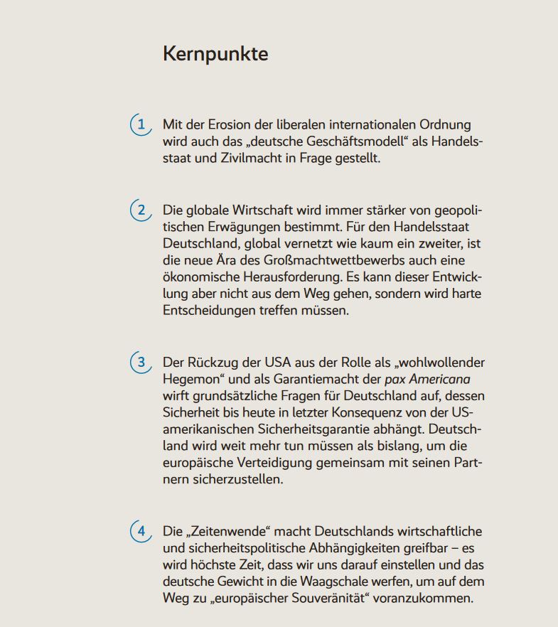 - Kaum ein anderes Land auf der Welt habe sich politisch, militärisch, wirtschaftliche aber auch intellektuell so gut auf die alte Ordnung eingerichtet, die im Wesentlichen auf US-amerikanische Initiative nach 1945 (im westlichen Teil) errichtet wurde und nach dem Kalten Krieg „globalisiert“ wurde. Aufgrunddessen sei Deutschland auch besonders verwundbar, wenn sich diese Ordnung auflöse (Kapitel 3). Der Instrumentenkasten der Außen- und Sicherheitspolitik sei ebenfalls noch weitgehend auf die alte Ordnung ausgerichtet und zudem nicht ausreichend ausgestattet