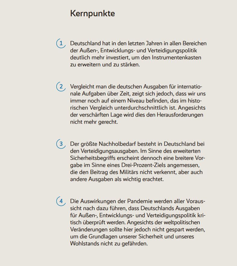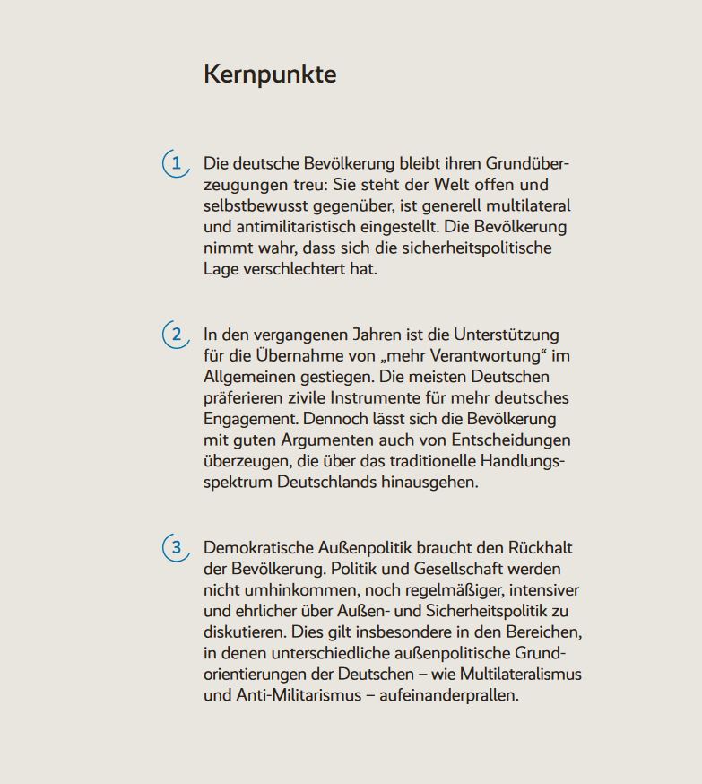 Es lässt sich so zusammenfassen, wie es auf Seite 22 steht: „[…] die Nachfrage nach deutschem Engagement in der Außen- und Sicherheitspolitik [ist] seit 2014 weit schneller gestiegen als das Angebot. Und so fällt Deutschland, obwohl es mehr tut, noch weiter hinter das zurück, was eigentlich nötig wäre“.
