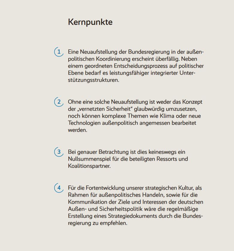 Regelmäßig vorzulegende nationale Strategie-Dokumente, wie es bei den Verbündeten und Partnern üblich sei, wäre auch sehr vorteilhaft: „Ein solches Papier und Zwischenberichte auf jährlicher Basis könnten Gegenstand von Debatten im Bundestag sein und dazu beitragen, in der Öffentlichkeit größeres Bewusstsein für die wichtigsten internationalen Themen zu schaffen.“ (S. 159, Seitenabsatz 3)