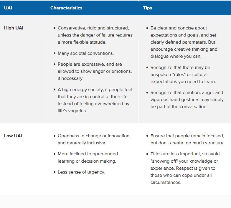 UAI is the extent to which people feel threatened by uncertain or unknown situations.