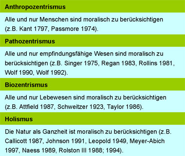 Schließlich zum Holismus: Im holistischen Weltbild werden auch Kollektivwesen wie Ökosysteme, Arten oder Populationen eine moralische Berücksichtigung hinzugeschrieben.