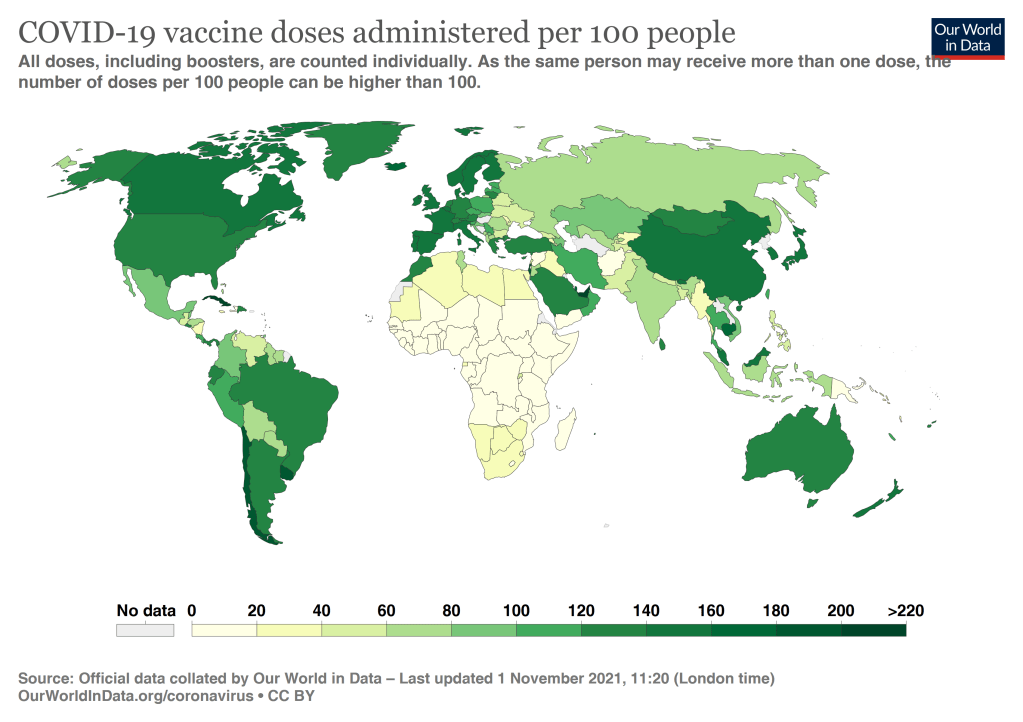 7.07 billion doses have been administered globally, and 26.65 million are now administered each day. Only 3.6% of people in low-income countries have received at least one dose.“ (OWD)