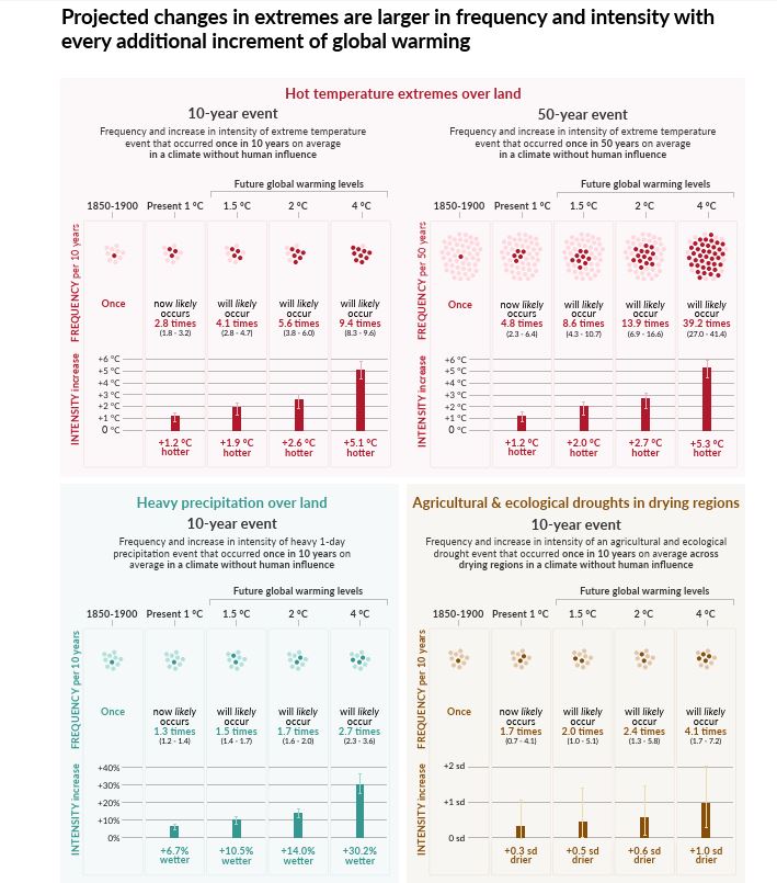 What an increase to 2.4 degrees means is shown by the following graphs, also from the 6th IPCC Report: