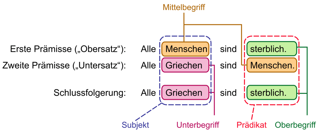 (Anmerkung: Das Grundverständnis des Syllogismus haben Sie auch ohne ins Detail über den vollkommenen und unvollkommenen Schluss zu gehen. Für Interessierte an der philosophischen Studie, aus der das Zitat kommt, in den Quellen am Ende finden Sie es)