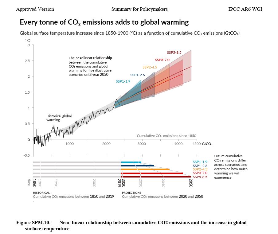 „This Report reaffirms with high confidence the AR5 finding that there is a near-linear relationship between cumulative anthropogenic CO2 emissions and the global warming they cause. Each 1000 GtCO2 of cumulative CO2 emissions is assessed to likely cause a 0.27°C to 0.63°C increase in global surface temperature with a best estimate of 0.45°C. This is a narrower range compared to AR5 and SR1.5. This quantity is referred to as the transient climate response to cumulative CO2 emissions (TCRE). This relationship implies that reaching net zero anthropogenic CO2 emissions is a requirement to stabilize human-induced global temperature increase at any level, but that limiting global temperature increase to a specific level would imply limiting cumulative CO2 emissions to within a carbon budget.“