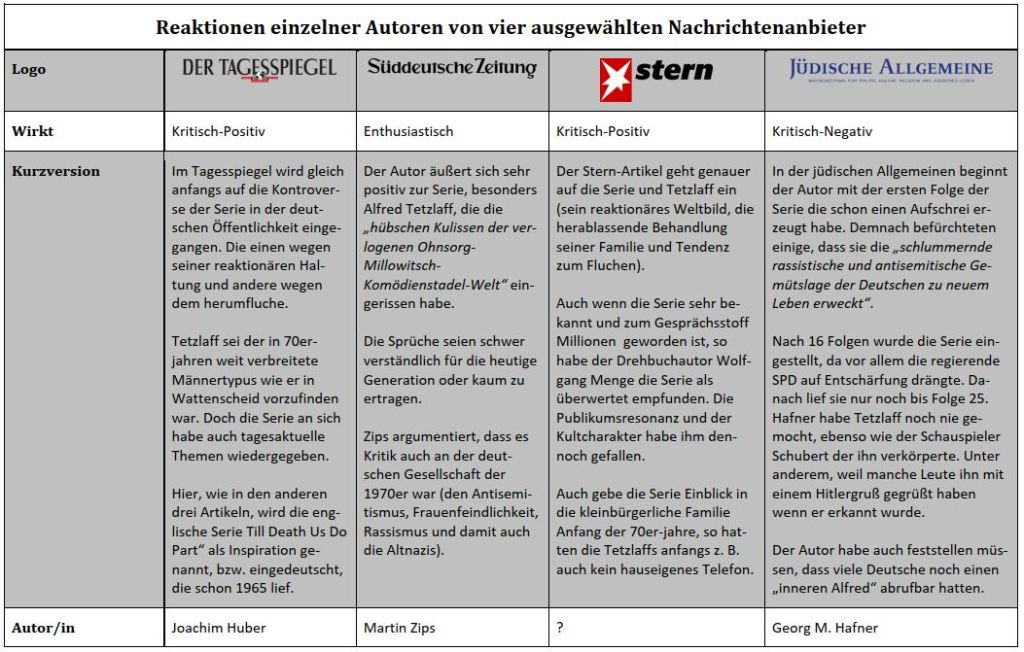 Zwar basiere die Sitcom auf der englischen Version „Till Death Us Do Part„, doch im Kontext der zwei Umfragen fügt der Autor hinzu: „Doch was im Mutterland der Demokratie ungefährlich war und selbstverständlich als Ironie verstanden wurde, war hierzulande durchaus ein Wagnis, denn es setzte Vertrauen in die demokratische Widerstandsfähigkeit des neuen Deutschland voraus.“ In Bezug auf heute sei die Sprachsensibilität eine große Errungenschaft und so eine Figur lächerlich, doch ein Grund zur Entwarnung ist es nicht da seine „Enkel“ nun auf sozialen Medien oder in Parliamenten äußern und in den neuen Bundesländern hohe Umfragewerte genießen.