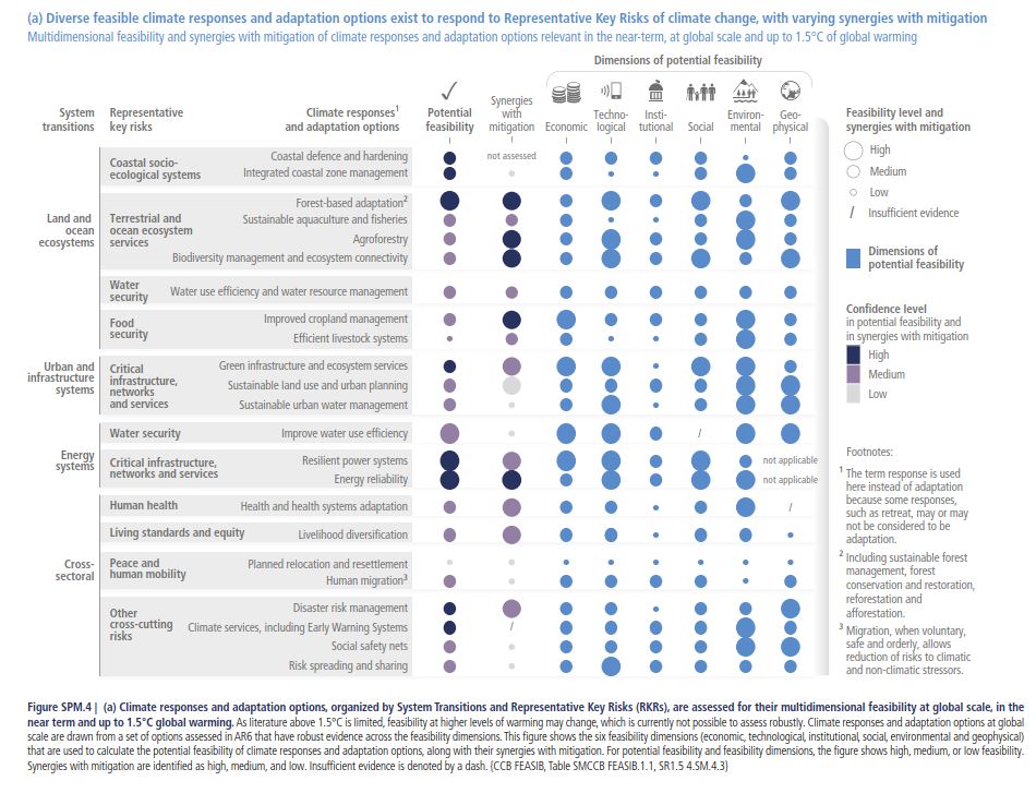 There are two very informative graphics included in the report of Working Group II, on page 22 and 23 respectively. Neatly summarized, the first graphic presents the key risks, the adaptations and responses, the potential feasibility, synergies with mitigation and the dimension of potential feasibility. As it is scientifically evaluated, you’ll see the same use of likelihood and confidence as in Working Group I.