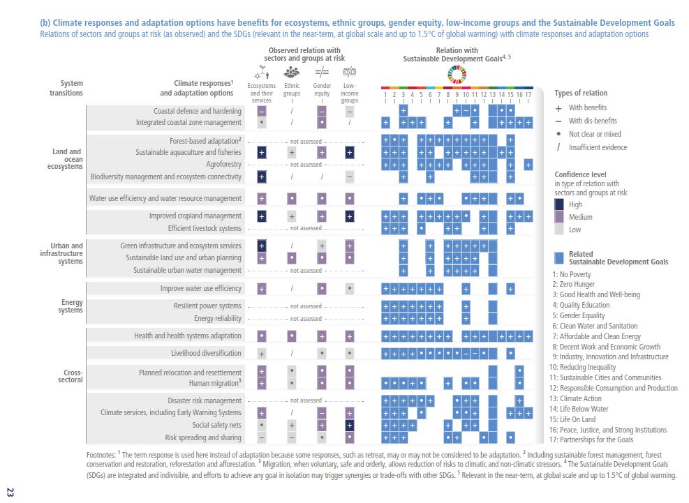 The second graphic shows how the climate adaptations and responses affect ecosystems, ethnic groups, gender equity and low-income groups. Further, the researchers also included how it relates to the Sustainable Development Goals.