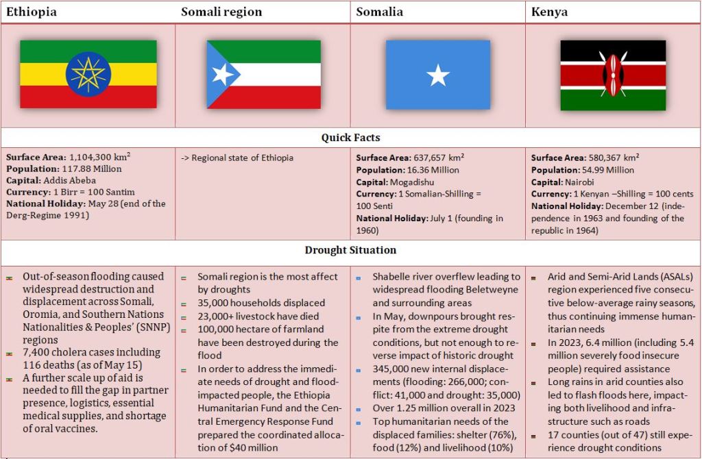 For a better overview, I made a table which includes the points of the article „East and Horn of Africa, and the Great Lakes Region: UNHCR Drought Situation Response Update #10 – May 2023“ by the reliefweb. I also included a few facts about each country from the book „Der Neue Kosmos – Welt Almanach & Atlas“.