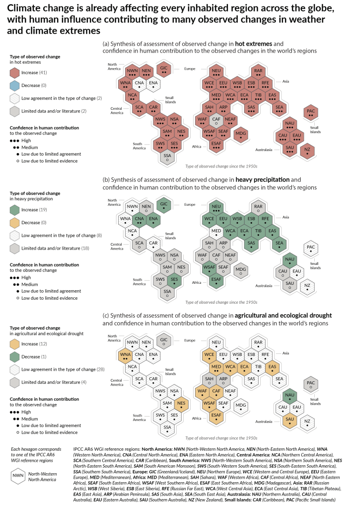 The change that is occurring in our climate is already affecting humanity, as the next figure will show. You may notice the striped hexagons (white-grey) and white hexagons, they indicate that there’s a low agreement in the type of change for the region as a whole; the grey hexagons, on the other hand, were used when there was limited data and/or literature that prevented assessment. Other countries indicate at least medium confidence.