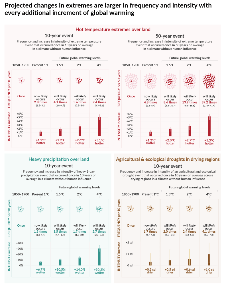 Lastly, we will have a look at the extremes without and with human influence. The following graphic shows hot temperature extremes over land (10-year and 50-year events), heavy precipitation over land (10-year events) and agricultural and ecological droughts in drying regions (also 10-year events). On the far left it shows without human influence, then the present frequency of said extremes and on the right the changes from 1.5 °C to 4.0 °C.