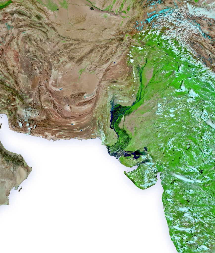 „The effect of the monsoon rains has been compounded by the continued melting of Pakistan’s 7,000 glaciers. The country holds the most glacial ice found outside the polar regions. Climate warming and recent heat waves have precipitated several glacial-outburst floods. In the rugged northern part of the country, the combined rain and meltwater has turned slopes into hill torrents.“ (source: NASA Earth Observatory)