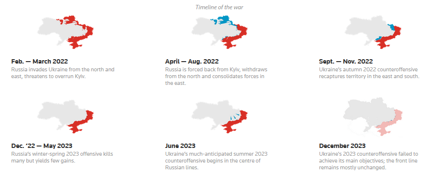 On February 24, 2022 the Russian War of Aggression started at 04:00 am in the morning, first they managed to conquer vast swathes of Ukrainian territory from February to March 2022, from April to August the Russian forces were forced back from Kyiv and from September to November of the same year, the Ukrainian counter offensive reconquered further territory. Since then, progress has been very slow especiall due to the lack of ammunition where Ukraine relies on supplies of Europe and the US especially.