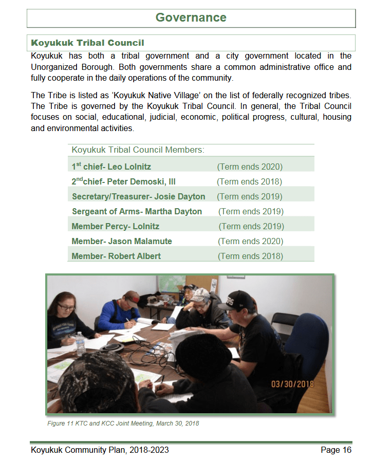 The Koyukuk Tribal Council operates from now under the Tribal Constitution of the Native Tribe of Koyukuk (source: 2018 Koyukuk Community Plan, p. 11). - 2012