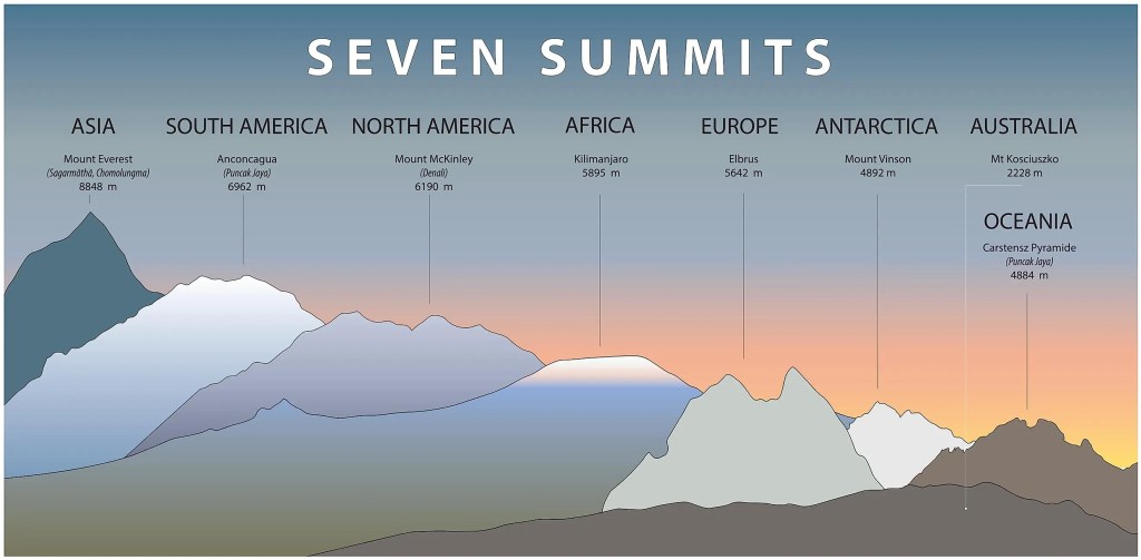 The Bass Seven Summits are Asia’s Everest (8,848 m), South America’s Aconcagua