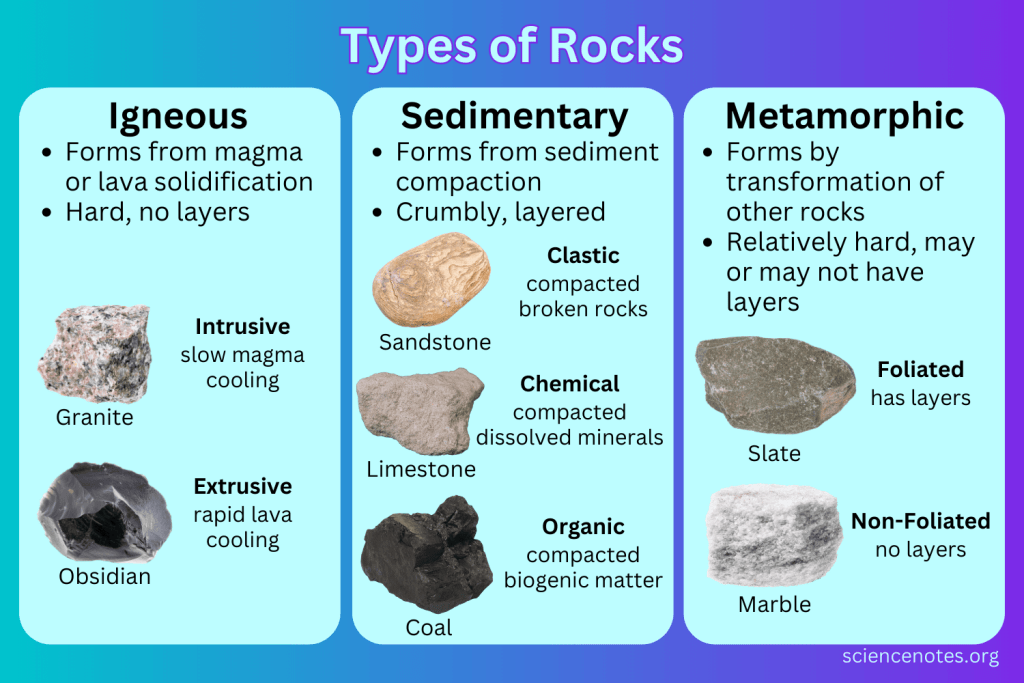 (Link: https://sciencenotes.org/types-of-rocks-igneous-sedimentary-metamorphic/)