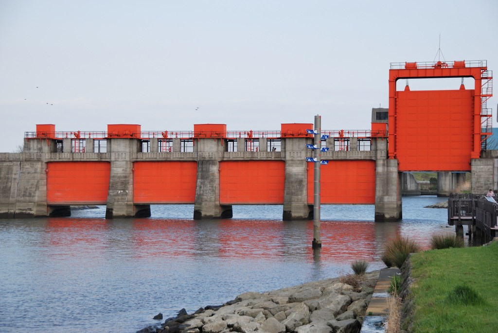 During the 1950s it was repainted and this is where it got the red colour from, by the locals it was subsequently known as the „Red Flood Gate“. While it no longer serves as a flood gate, after being retired in 1982 and replaced by the „Blue Flood Gate“ downstream, it has been certified as a modern industrial heritage side by the Ministry of Economy, Trade and Industry. The robust structure of the new flood gate can withstand a major flood that occurs once every 200 years; it has three gates that are 20 meters wide and 16 meters tall.
