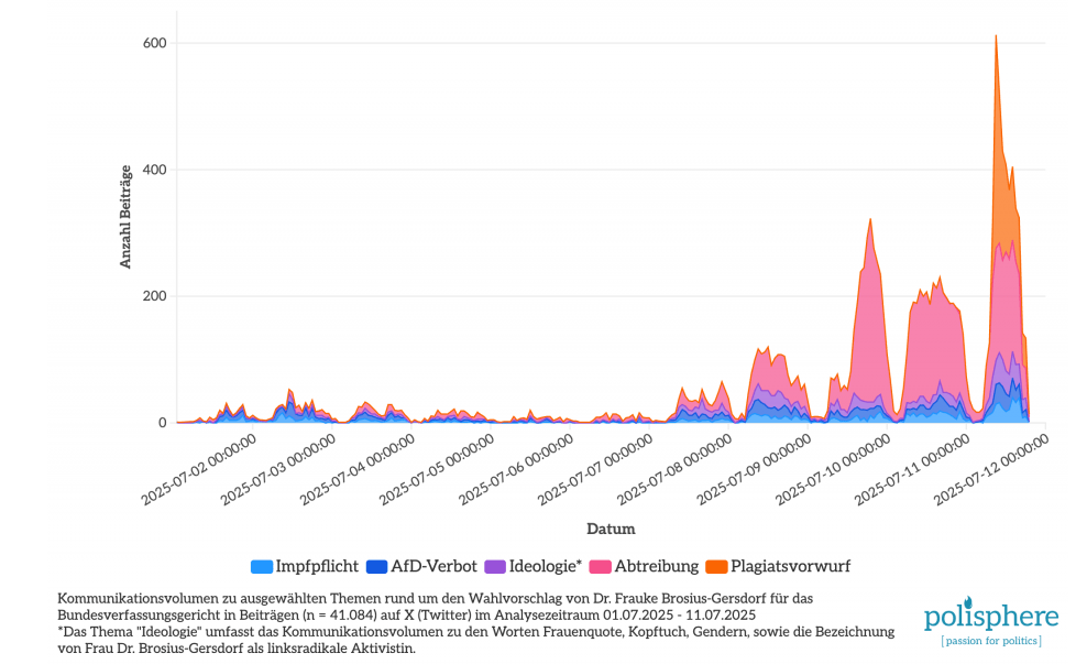 Wie wir über die fast zwei Wochen sehen gab es verschiedene Versuche: zuerst die Impflicht, das AfD-Verbot und die „Ideologie“ (wozu auch die Lüge gehört, dass Brosius-Gersdorf eine „linksradikale Aktivistin“ sei) – das aber fand kaum Anklang. Mobilisierungspotential hingegen hatte die Abtreibung und gegen Ende noch der falsche Plagiatsvorwurf, so sehen wir ab dem 8. Juli wie die Kurve nach oben schnellt.