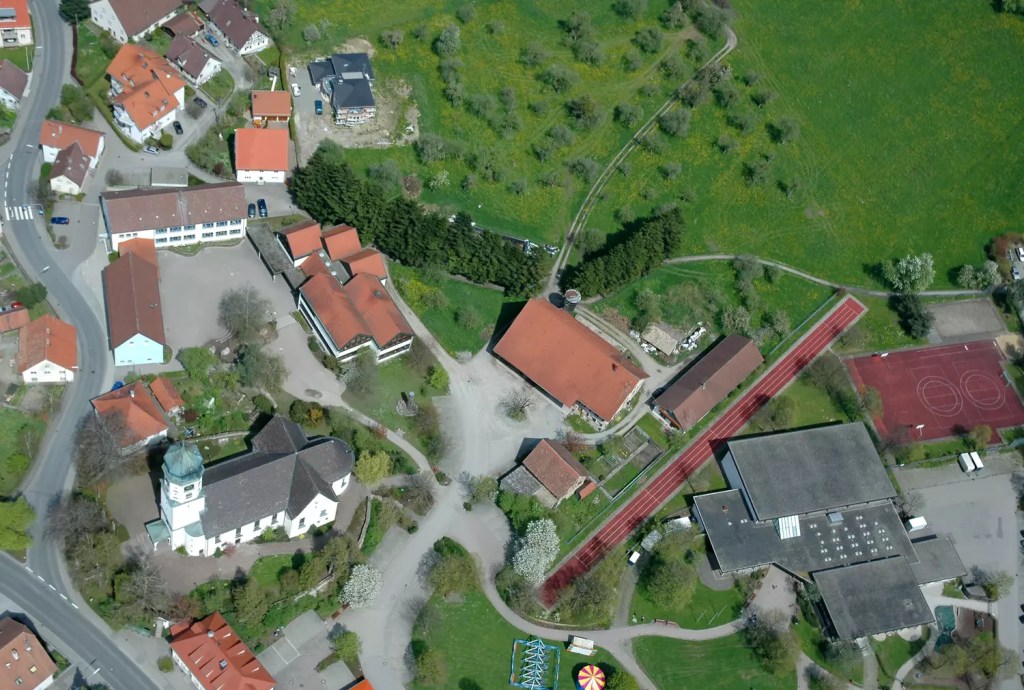 The aerial view above shows you Bergatreute as of before the reconstruction of one part of the school (the four larger buildings with a big court inside). The church with its onion dome stands quickly out as well does the long red line of the gym of the school.