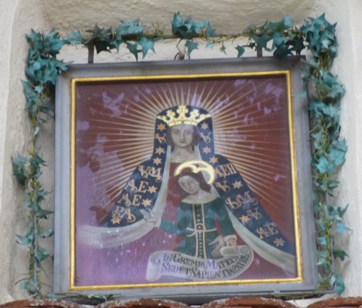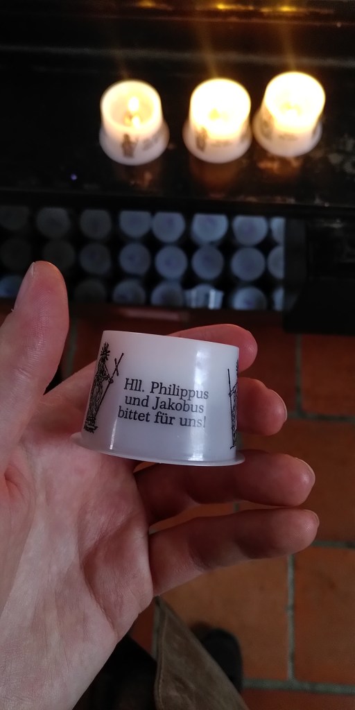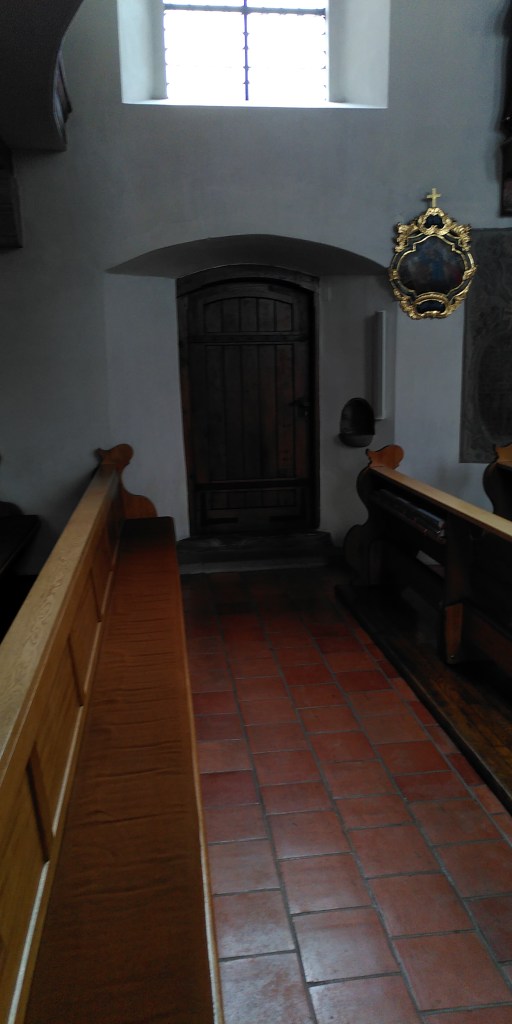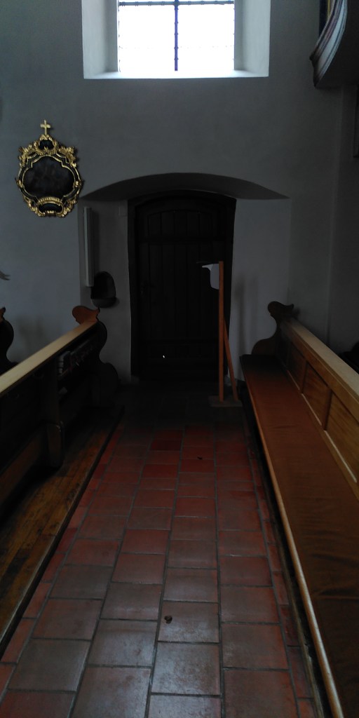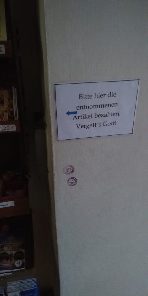 On your way in and out you can buy the church guide, hymnbooks, books or postcards and put the money in the mailbox-like register. The sign in picture 1 saying „God bless you!“.