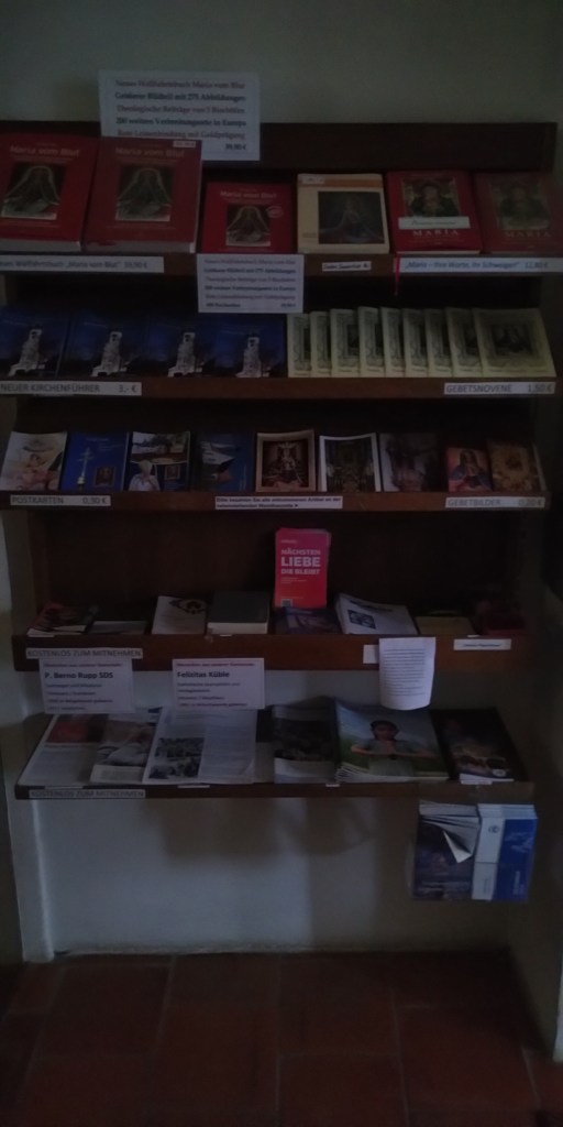 Auf den Weg nach draußen oder nach drinnen können Sie auch den Kirchenführer, Gesangsbücher, Bücher und Postkarten kaufen und das Geld in die Briefkasten-ähnliche Kasse einschmeißen. Das Schild sagt „Vergelt’s Gott“, hört sich vielleicht erst bedrohlich an wenn Sie nicht aus Süddeutschland, Südtirol oder Österreich sind (oder es bisher noch nicht gehört haben), aber es ist eine altmodische Dankesformel.