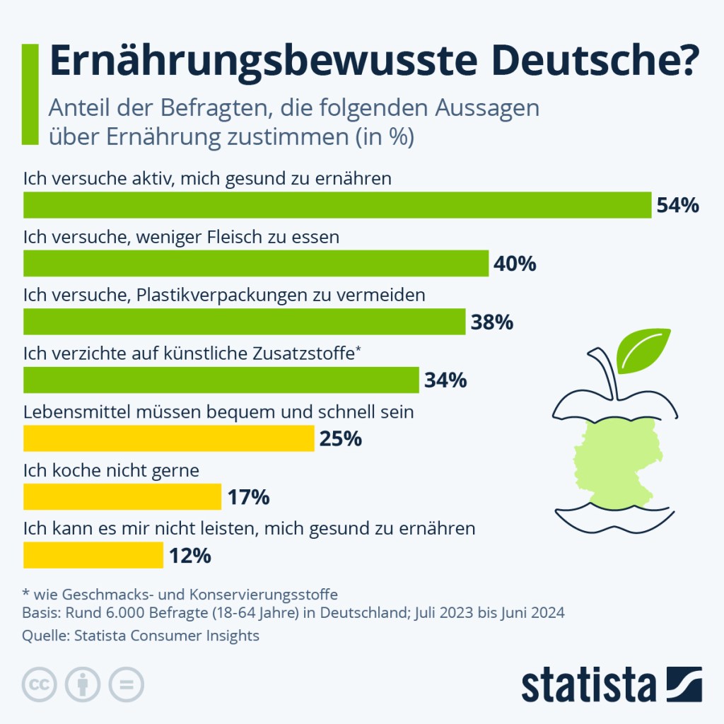 Laut einer Umfrage von 6.000 18-64 jährigen, von Juli 2023 bis Juni 2024, gaben 54% der Deutschen an sich aktiv darum zu bemühen sich gesund zu ernähren. 40% gaben an, weniger Fleisch essen zu wollen und 38% versuchen Plastikverpackungen zu vermeiden.