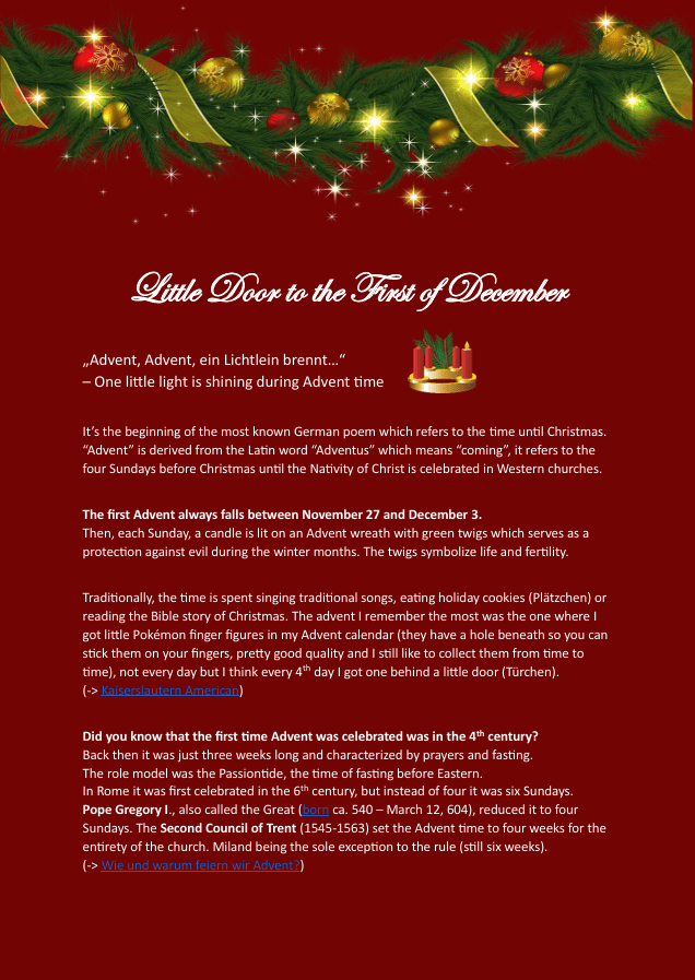 Before we move on to the actual advent calendar, let’s see how we’ve got here in the first place. Advent is latin and means „coming“, it originates from Christian customs to prepare spiritually for Christmas. It’s both for the celebration of the birth of Jesus Christ and the in preparation of the Second Coming of Christ (-> „Early Christians believed the Advent to be imminent, and most Christian theologians since then have believed that the visible appearance of Jesus may occur at any moment and that Christians should be ever ready for it“).