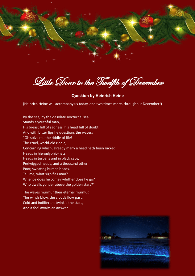 It’s the beginning of the most known German poem which refers to the time until Christmas. “Advent” is derived from the Latin word “Adventus” which means “coming”, it refers to the four Sundays before Christmas until the Nativity of Christ is celebrated in Western churches.