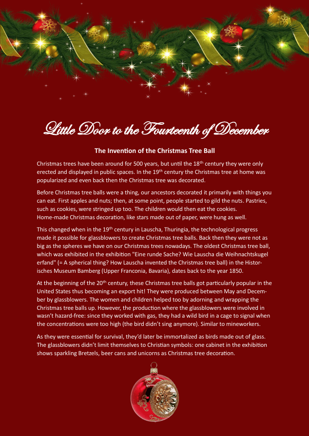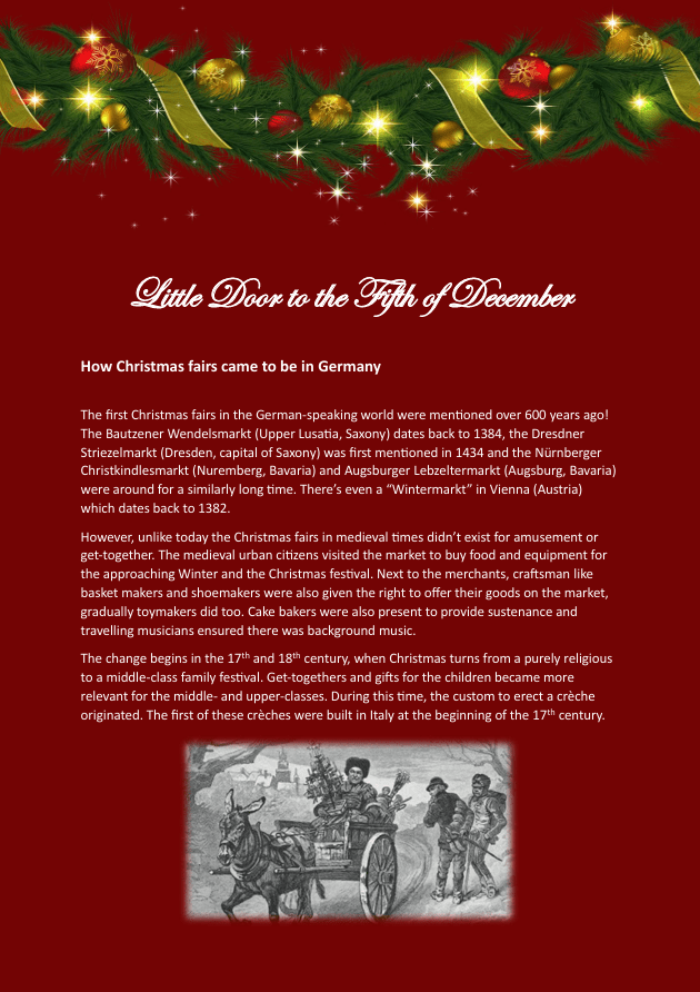 There’s another story as well where a Munich housewife created the analogue calendar, because she was tired of „having to answer endlessly when Christmas would come“.