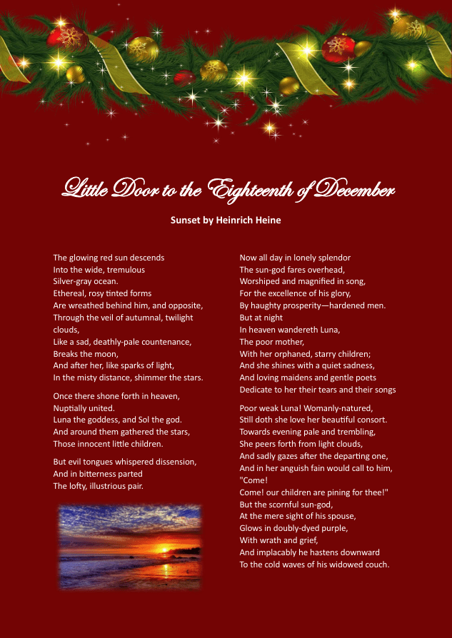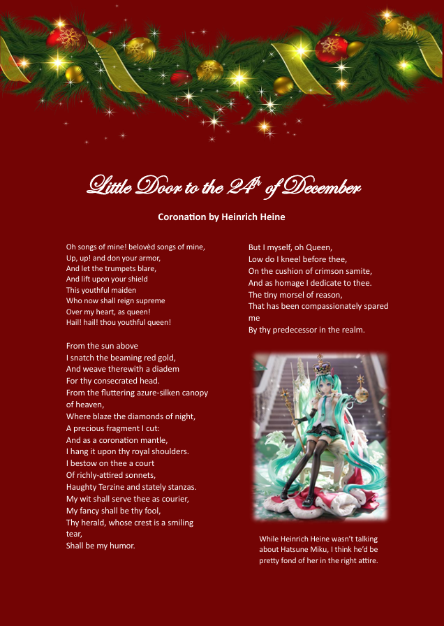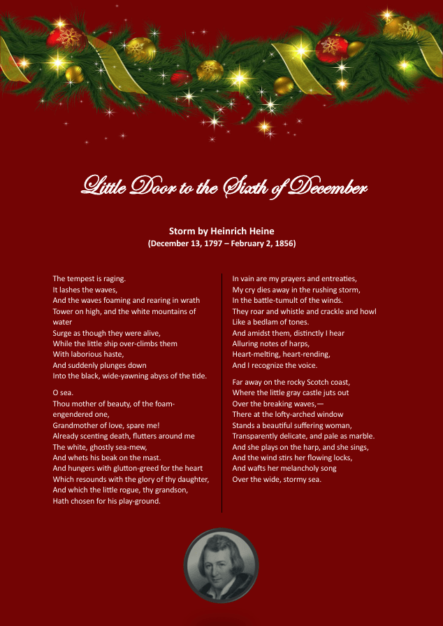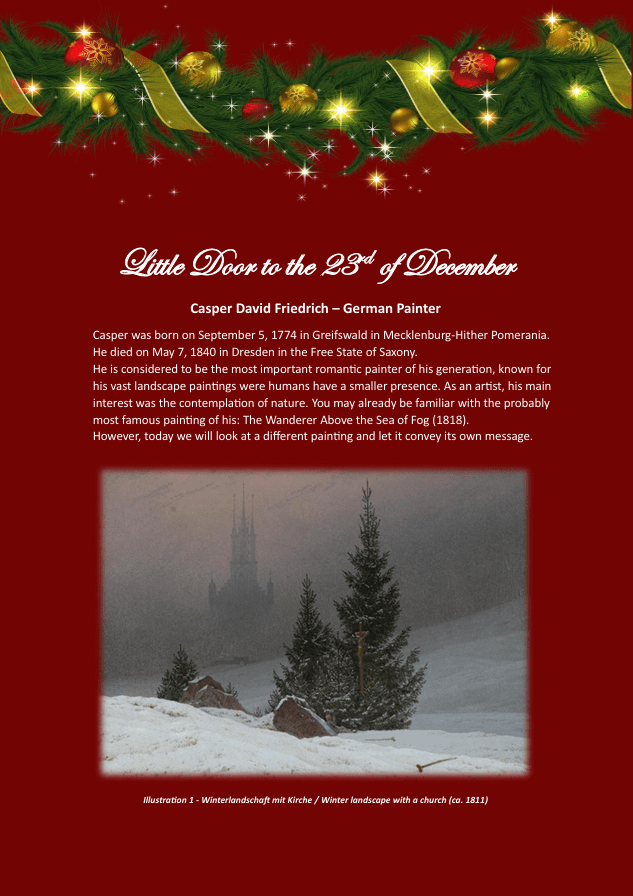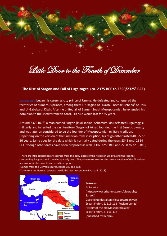Last year, I published my Discord advent calendar on here. This years advent calendar focused more on spreading knowledge (the previous had a greater focus on poets and peoms) from the history of the Christstollen to the creation of humans in Sumerian myth, but we also have two paintings featured and four poems from Heinrich Heine! The history of the advent calendar (AC) remains unchanged, included for the sake of completeness. There’ll also be elaborations added to some little doors (Türchen, as they are called in German), since one DIN A4 page forces me to condense information to the best possible degree. Without further ado, let’s begin!