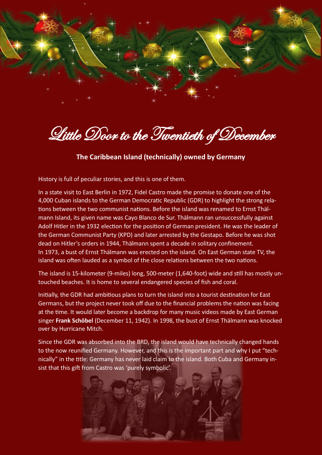 Since the GDR was absorbed into the BRD, the island would have technically changed hands to the now reunified Germany. However, and this is the important part and why I put “technically” in the title: Germany has never laid claim to the island. Both Cuba and Germany insist that this gift from Castro was ‘purely symbolic’.