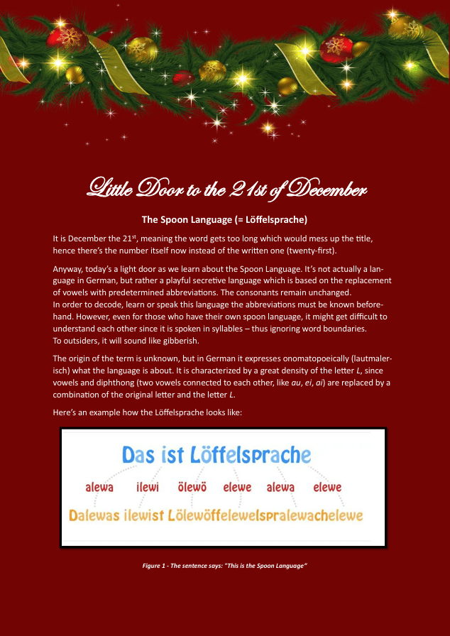 Anyway, today’s a light door as we learn about the Spoon Language. It’s not actually a language in German, but rather a playful secretive language which is based on the replacement of vowels with predetermined abbreviations. The consonants remain unchanged. In order to decode, learn or speak this language the abbreviations must be known beforehand. However, even for those who have their own spoon language, it might get difficult to understand each other since it is spoken in syllables – thus ignoring word boundaries. To outsiders, it will sound like gibberish.