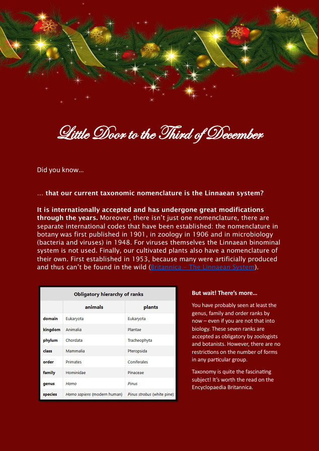 It is internationally accepted and has undergone great modifications through the years. Moreover, there isn’t just one nomenclature, there are separate international codes that have been established: the nomenclature in botany was first published in 1901, in zoology in 1906 and in microbiology (bacteria and viruses) in 1948. For viruses themselves the Linnaean binominal system is not used. Finally, our cultivated plants also have a nomenclature of their own. First established in 1953, because many were artificially produced and thus can’t be found in the wild (Britannica – The Linnaean System).