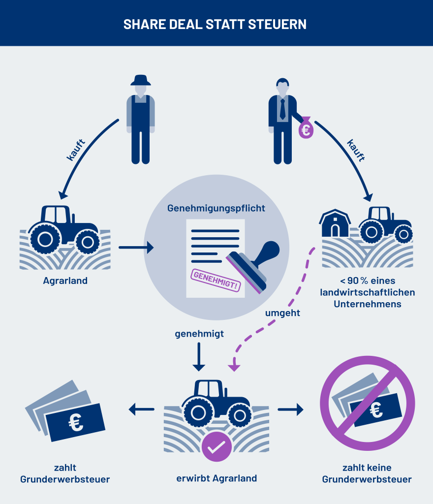 Eigentlich gibt es gesetzliche Regelungen die die Landwirte schützen sollte, dies wird aber von den Investoren durch die oben genannten Share Deals umgangen. Zu den Fachfremden Unternehmen und reichen Personen, die Agrarland nur als Investment sehen, gehören in Deutschland das Versicherungsunternehmen Münchener Rück, Quarterback Immobilien (Wohnungskonzern Vonovia), die Aldi-Nord-Erben und die Möbelhaus-Familie Steinhoff.