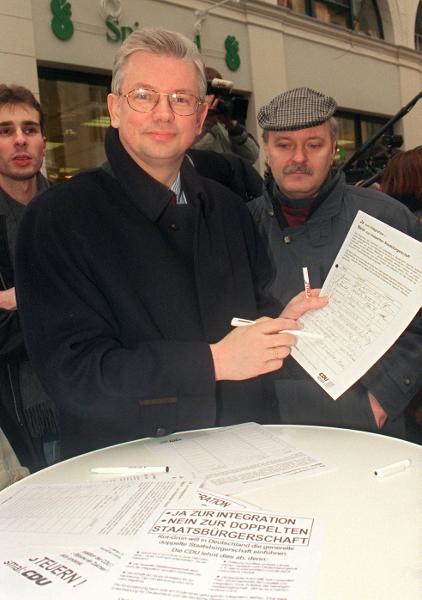 „Unter der Parole „Ja zu Integration – Nein zu doppelter Staatsangehörigkeit“ wurden die Bürger aufgefordert, sich für verstärkte Integrationsbemühungen und gegen die doppelte Staatsangehörigkeit auszusprechen. Besonders im hessischen Landtagswahlkampf 1999 wurde die Debatte um die doppelte Staatsbürgerschaft durch den hessischen CDU-Landesvorsitzenden Roland Koch politisch instrumentalisiert. […] Vertreter anderer Parteien, aus Verbänden, aber auch aus den eigenen Reihen kritisierten die Kampagne scharf und warfen der Union vor, durch ihre Polemik Ausländerhass zu schüren.“ (Quelle: German History in Documents and Images)