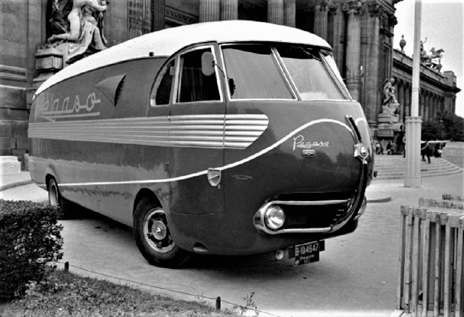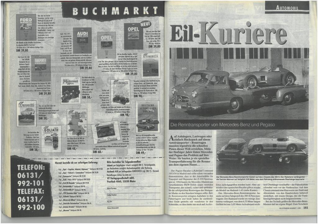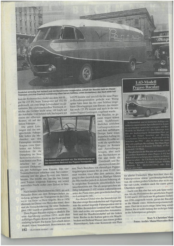 Der Pegaso Bacalo („Kabeljau“) entstant 1953/54 in Madrid und sollte schon von außen demonstrieren, dass er der Auserwählte für Transport und Reperatur des Z-102-Sportwagen ist. 1954 bauten die Mercedes-Mannen aus verschiedenen PKW-Teilen einen rasenden Transporter, der schnell, sicher und spektakulär die erfolgreichen Rennwagen der Suttgarter MAkre zu den Strecken bringen sollte. Beide Renntransporter erregten Aufsehen in den Fahrerlagern und beide haben ihr unrühmliches Ende gemein: sie wanderten in den Schredder, so dass heute nur noch auf Archivfotos zurückgegriffen werden kann. Aber zumindest den spanischen Bacalao gibt es wieder als Modell im Maßstab 1:43 (siehe Kasten [nächste Seite, 182]).